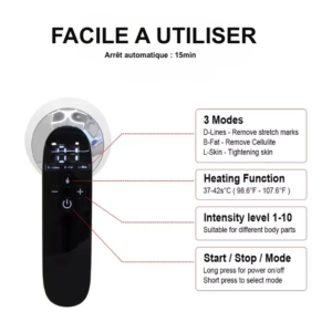 Notre masseur anti-cellulite propose 3 modes ciblés pour répondre à vos besoins : D-Line (réduction des vergetures), B-Fat (brûlage des graisses) et L-Skin (raffermissement de la peau). Chaque mode est équipé d’une fonction chauffante et de 10 niveaux d’intensité ajustables selon votre tolérance cutanée.