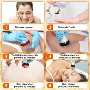 Cette technologie dissout la graisse, stimule le drainage lymphatique, raffermit la peau et améliore son élasticité. Elle exerce un effet anti-gravité sur la peau, en attirant et en agissant à travers un massage rythmique. Les tissus conjonctifs fibreux des différentes couches de la peau sont ainsi adsorbés et diffusés vers l’extérieur, contribuant à un raffermissement visible et une peau plus lisse.