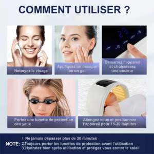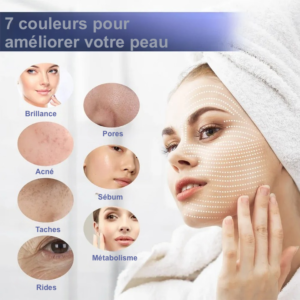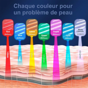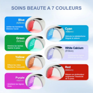 - 7 couleurs de luminothérapie : Chaque couleur est adaptée à une fonction précise pour répondre aux besoins spécifiques de votre peau.