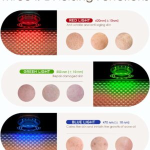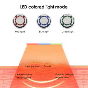 Photothérapie Faciale à 3 LED: Ce masseur facial anti-rides propose trois types de photothérapie : la lumière rouge pour stimuler la circulation sanguine et combattre les signes de l’âge ; la lumière verte pour éliminer les taches sombres, les taches de rousseur, et éclaircir le teint ; et la lumière bleue pour apaiser la peau et réduire la croissance de l’acné.