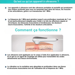 - Combine les effets des ultrasons, de la chaleur et de l’acupuncture pour un traitement 3 en 1