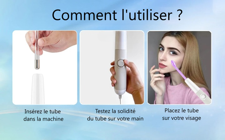 Insérez le tube entièrement dans l’appareil anti-rides, sélectionnez le niveau qui vous convient, et commencez le traitement. Plus le niveau est élevé, plus les résultats seront efficaces. Il est conseillé de l’utiliser 2 à 3 fois par semaine pour des résultats optimaux. La technologie haute fréquence, entièrement sûre et naturelle, stimule l’éclat naturel de la peau en oxygénant et revitalisant les différentes couches cutanées.