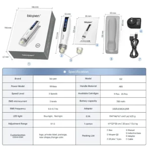 Le stylo BioPen Q2 associe trois technologies avancées : micro-aiguilles, électroporation EMS et luminothérapie LED. Il répond à divers besoins esthétiques, tels que la réduction des ridules et des rides, le resserrement des pores, l’atténuation des cicatrices d’acné, l’uniformisation du teint et de la texture de la peau, ainsi que la diminution des vergetures sur l’abdomen et les cuisses. Il favorise également la stimulation de la croissance des cheveux et de la barbe.