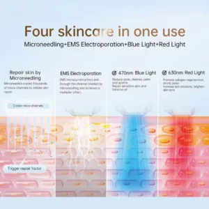 Luminothérapie LED : Intègre des lumières rouge (630 nm) et bleue (470 nm) pour cibler divers problèmes cutanés, de la réduction de l’inflammation à la promotion de la régénération de la peau.