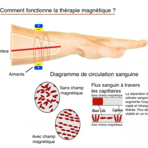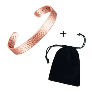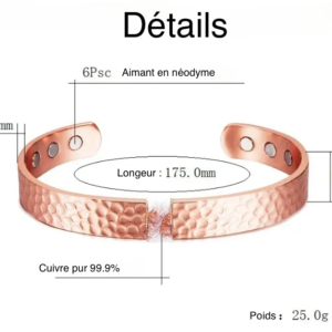 Effet magnétique : Le bracelet intègre des aimants subtilement intégrés qui agissent en synergie avec le cuivre, créant un champ magnétique doux autour du poignet. Ce champ est censé stimuler la circulation sanguine, réduire les tensions musculaires et améliorer l’équilibre énergétique du corps.