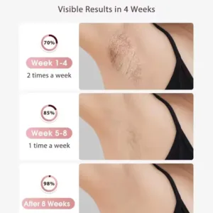 ✔ 8 semaines : Réduction visible des poils, jusqu’à 75 % de diminution en 4 semaines. La peau devient plus douce et soyeuse.