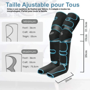 Chaleur apaisante : Le masseur Comfier pour pieds offre 3 niveaux de chauffage pour s’adapter à vos besoins. Grâce à sa fermeture Velcro, il s’ajuste facilement à différentes tailles, avec une circonférence maximale du mollet de 48,26 cm et une largeur de cuisse de 68,58 cm.