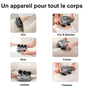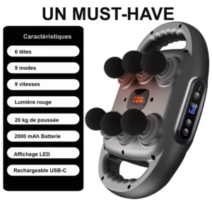 - 6 têtes interchangeables adaptées à différentes zones du corps pour un massage ciblé et efficace.