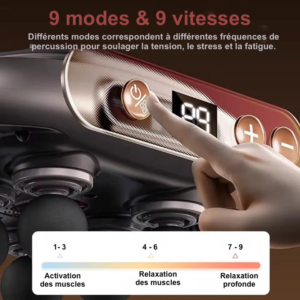 Ce pistolet de massage est incroyable ! Les 6 têtes de massage et les 9 modes d’intensité offrent une véritable expérience de détente musculaire. La lumière rouge ajoute une touche de bien-être supplémentaire. Je le recommande à toutes les femmes actives !