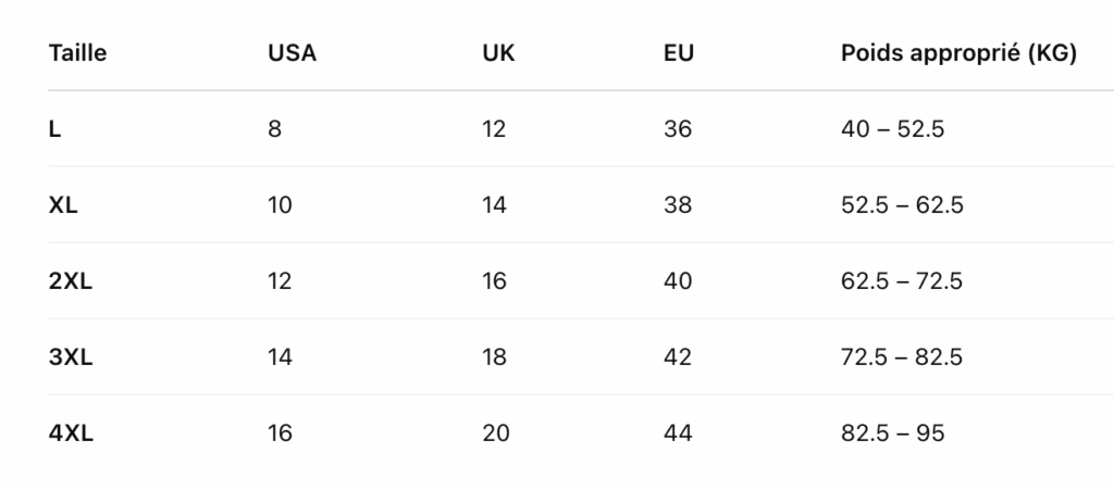 Du L au 4XL — veuillez vous référer au tableau des tailles pour choisir celle qui vous convient.
